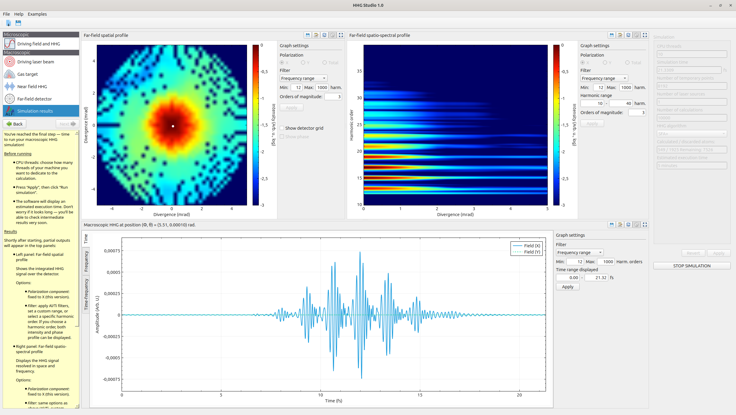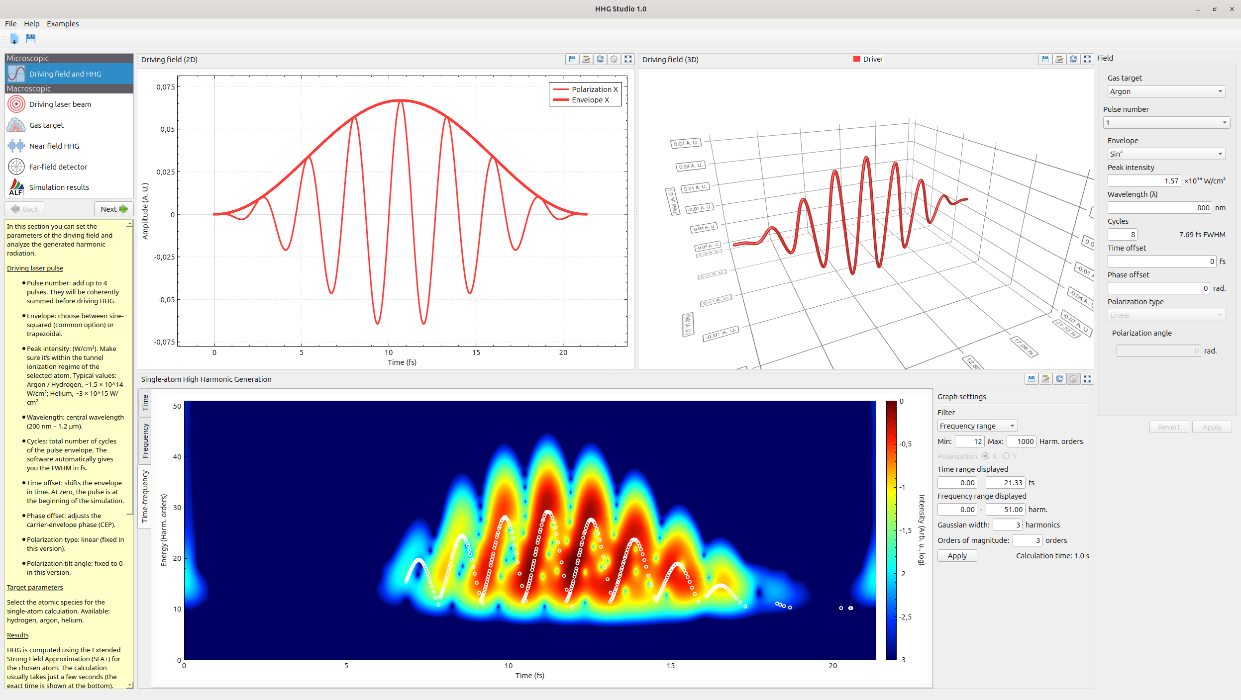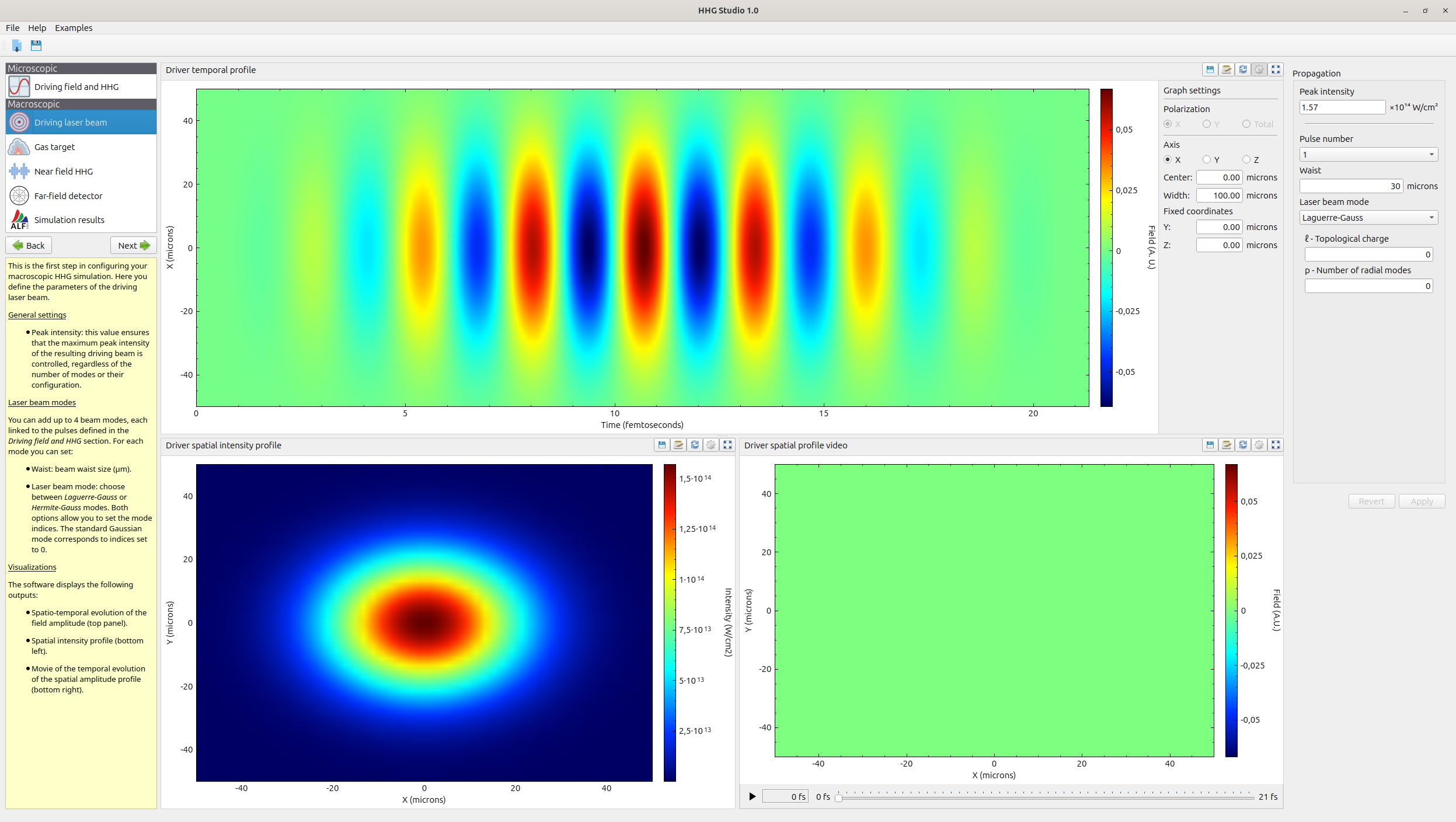 You can select the spatial profile using different Laguerre-Gauss and Hermite-Gauss combinations. You can visualize the field, intensity and phase of your driving pulse in the whole simulation space, with different graphical controls configurable graphs and a video control that shows the time evolution.