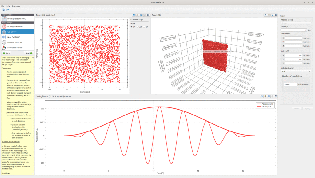 Select the location, shape and distribution and the gas of your target. You can configure a single plane or an entire volume for your macroscopic simulations. Selecting different points, you can preview your driving field.