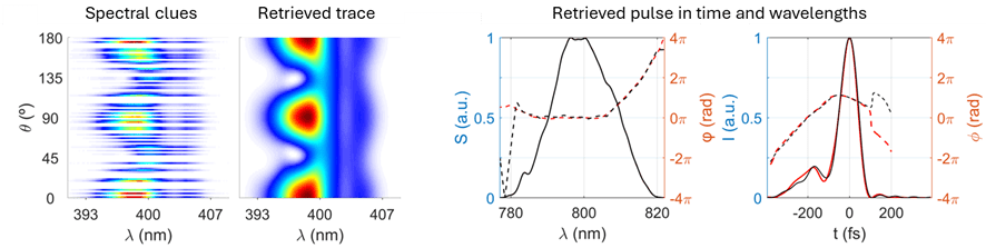 In this way, the algorithm gradually refines its hypothesis about the pulse —its intensity, phase, and polarization— without needing to assume its shape in advance. It just needs enough spectral clues to piece together the full structure, step by step.